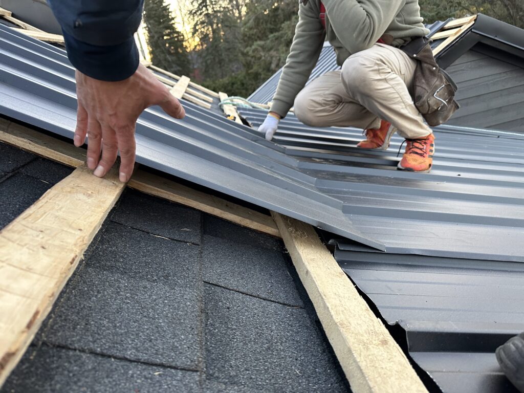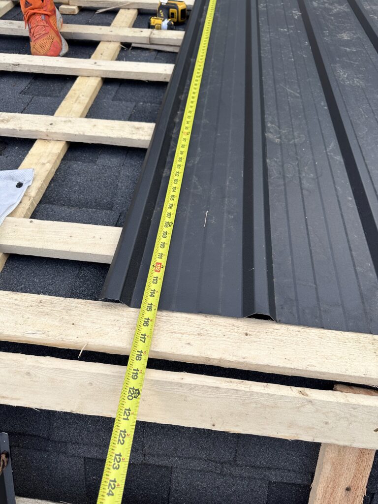 For this project, the metal roof was installed directly over the existing asphalt shingles, which continue to serve as a secondary protective layer for the roof deck. No additional membrane or Blueskin was used. Instead, a strapping system was installed to create continuous airflow between the existing roof and the new metal system. This air gap improves ventilation and helps prevent moisture buildup beneath the panels.