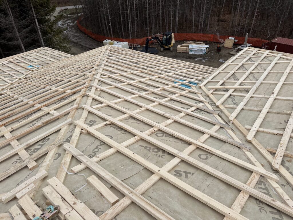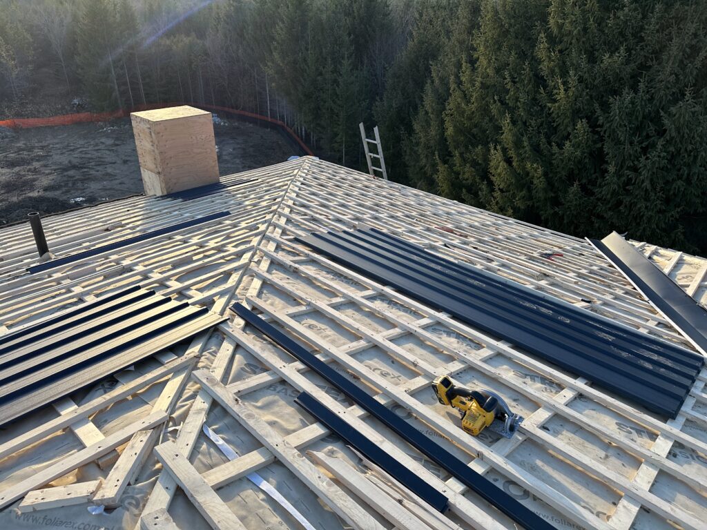 The roofing system was built with a focus on durability, efficiency, and long-term performance. A waterproof membrane was installed beneath the plywood deck, providing an additional layer of protection against moisture infiltration from below. Above the deck, a full wood strapping system was applied to create a continuous օդ airflow gap between the structure and the metal panels, ensuring proper ventilation and reducing the risk of condensation.