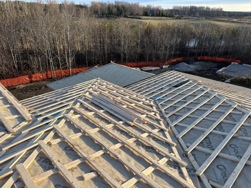 The roof was finished using eco standing seam metal panels, designed to replicate the clean vertical lines of traditional standing seam systems while offering a more cost-effective solution. The panels were manufactured from zinc-magnesium coated steel, providing enhanced corrosion resistance and long-term durability in Ontario’s variable climate conditions.
