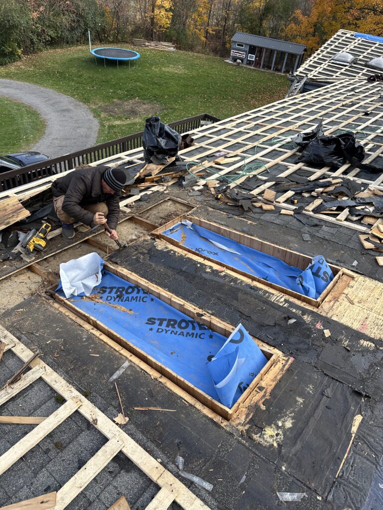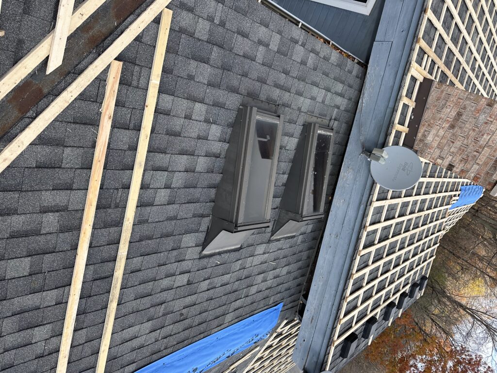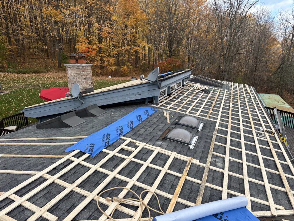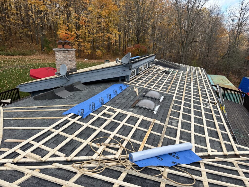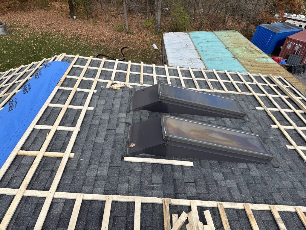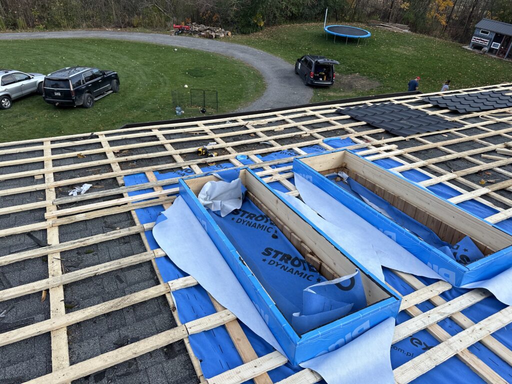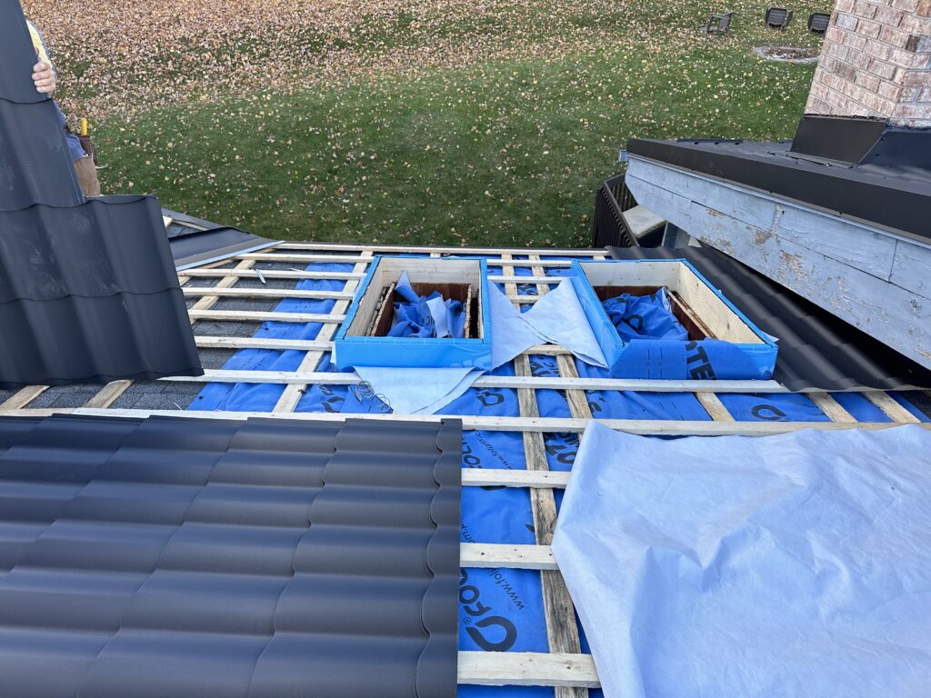 The existing asphalt shingles were left in place and used as a protective base layer for the roof deck. Our team installed a strapping system directly over the shingles, creating the required ventilation space for the metal roofing panels while avoiding unnecessary removal of the existing roofing materials.