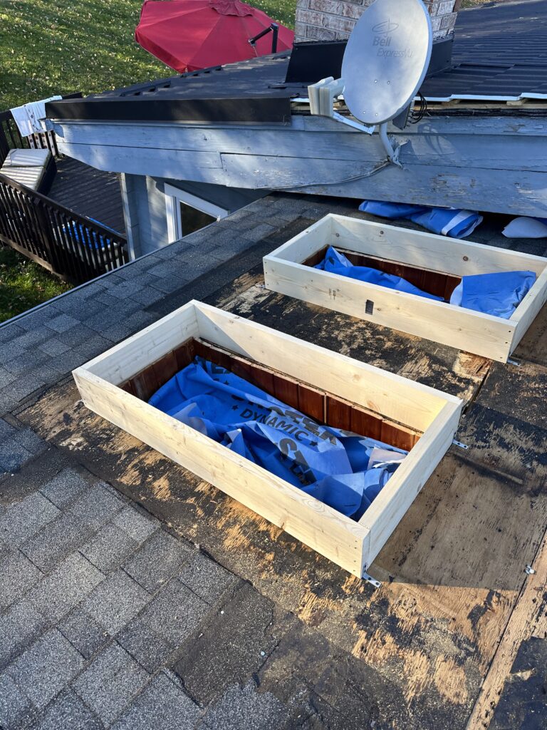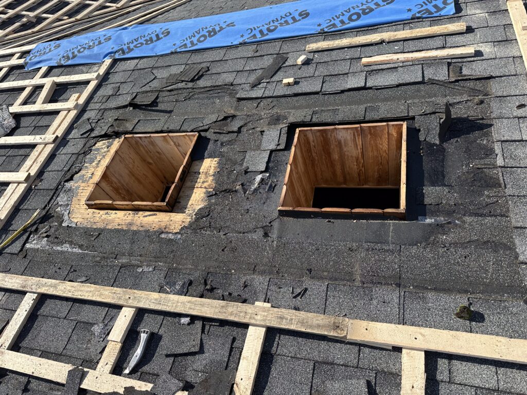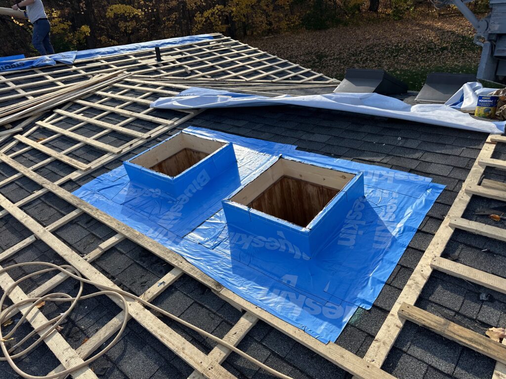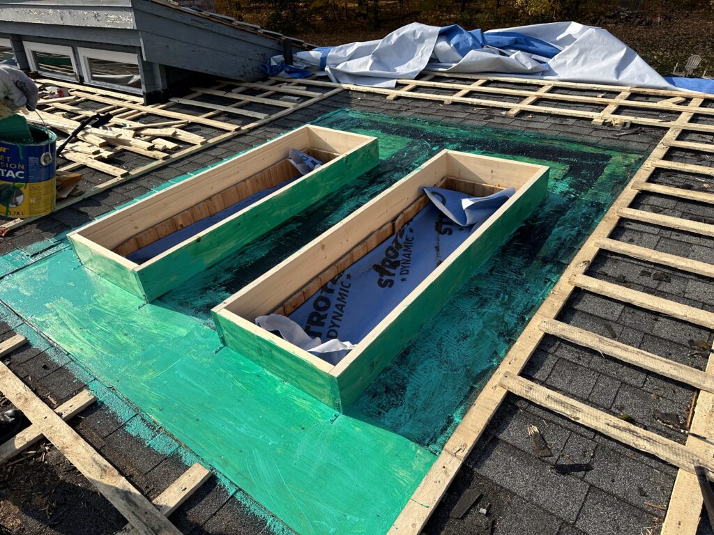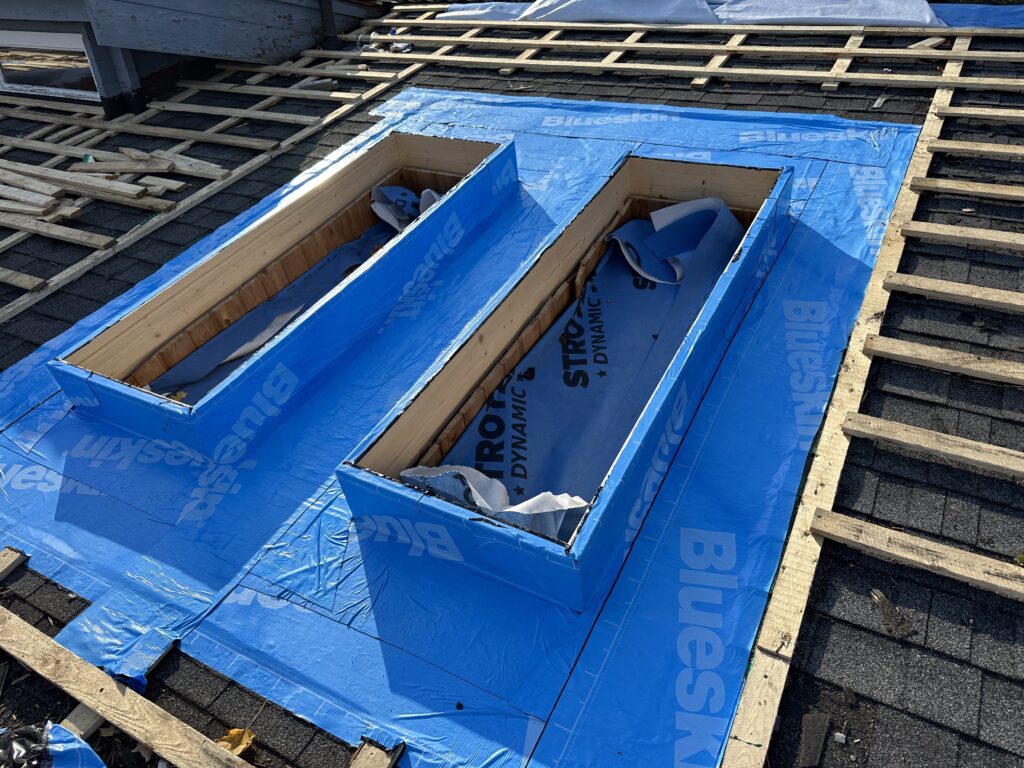 A significant part of this project was the complete replacement of seven skylights. All existing skylights were carefully removed to allow for proper preparation of the roof openings. New skylight boxes were installed and the surrounding areas were sealed using Soprema Blueskin membrane with primer, ensuring reliable waterproofing around each penetration.